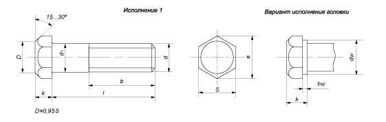 Выполнена с уменьшенной шестигранной головкой с высотой от 5 до 26 мм. Диаметр гладкой части стержня составляет 8-48 мм. Болты ГОСТ 7808-70 выполняются с высоким классом точности А, применяются в особо ответственных соединениях. При производстве используют легированные, углеродистые конструкционные стали — 20Г2Р, 20кп, 35 и др. Болт ГОСТ 7808-70 выполняется с метрической резьбой. Ее номинальный диаметр — М8-М48 с шагом от 1 до 5 в зависимости от типа. Изготавливается с размером под ключ в диапазоне 12-70. Длина резьбовой части колеблется 22-121 мм в зависимости от величины длины болта. Метиз подвергается оцинковке с помощью гальванического способа или термодиффузионного. Точность изготовления обозначается в виде поля допуска. С учетом 7808-70 — 6g.