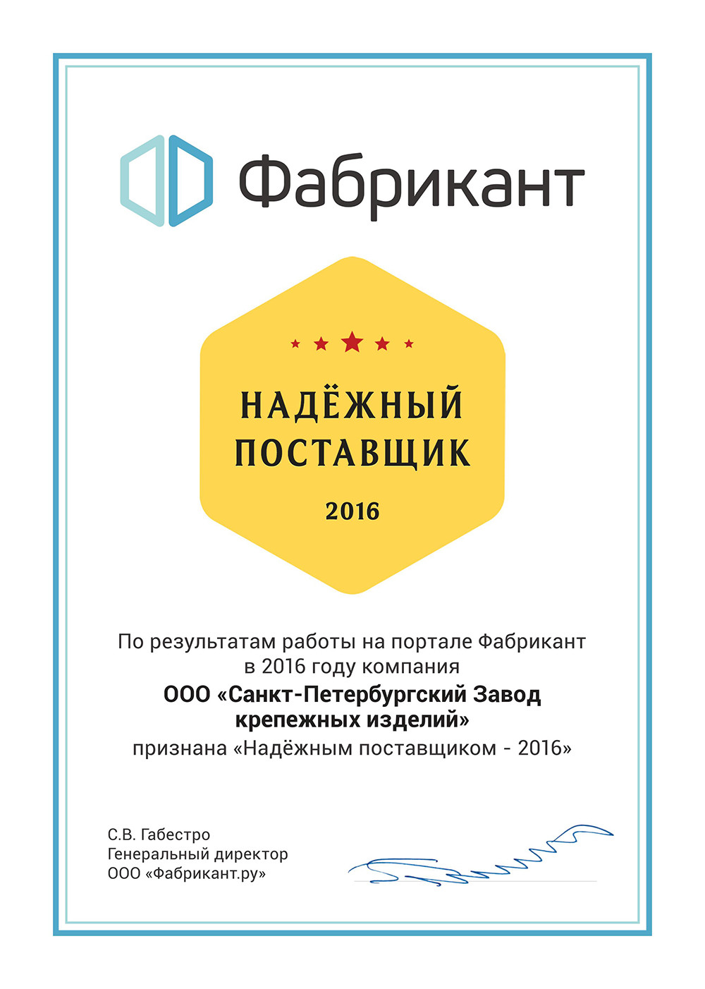 СПБЗКИ получил звание Надёжный поставщик - 2016
